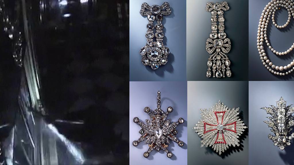 Auf dem Schwarz-Weiss-Film aus der Überwachungskamera im Juwelenzimmer ist zu sehen, wie zwei Männer mit Taschenlampen den Raum betreten. Einer von ihnen, mit einer Kapuze auf dem Kopf, schlägt mit einer Axt auf die Scheiben der Vitrine ein und versucht, sie aufzubrechen.