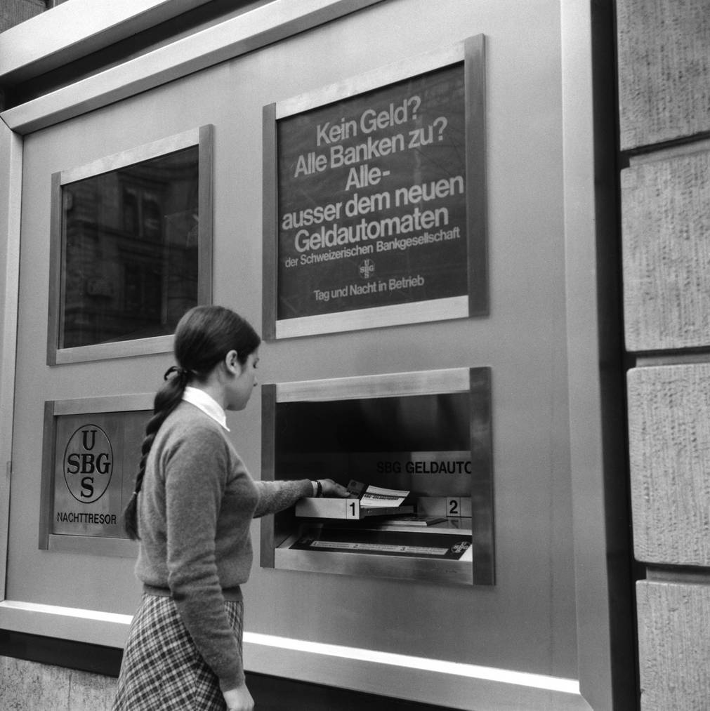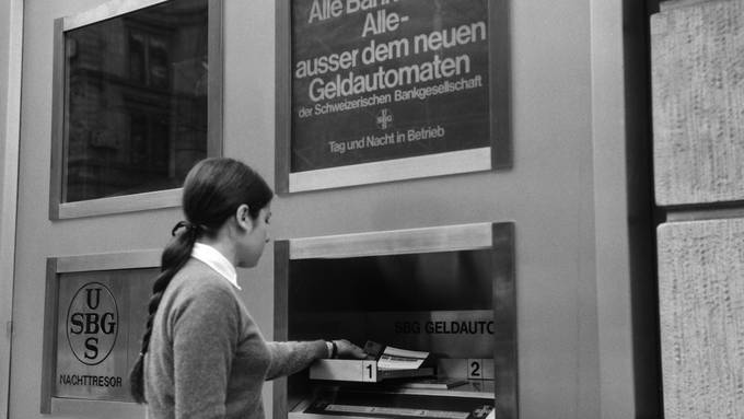Es war eine Revolution: Am 1. November 1967 war es soweit, der 1. Bankomat der Schweiz wurde in Betrieb genommen. Bei der damaligen SBG (Schweizerische Bankgesellschaft), heute UBS, konnte man mit einer Geheimzahl und einer Lochkarte aus Papier 200 Franken aus dem Automaten abheben.