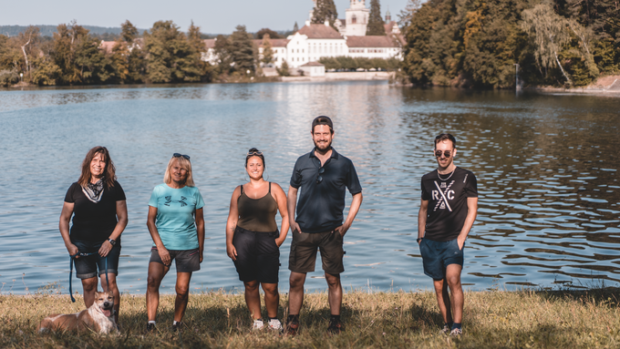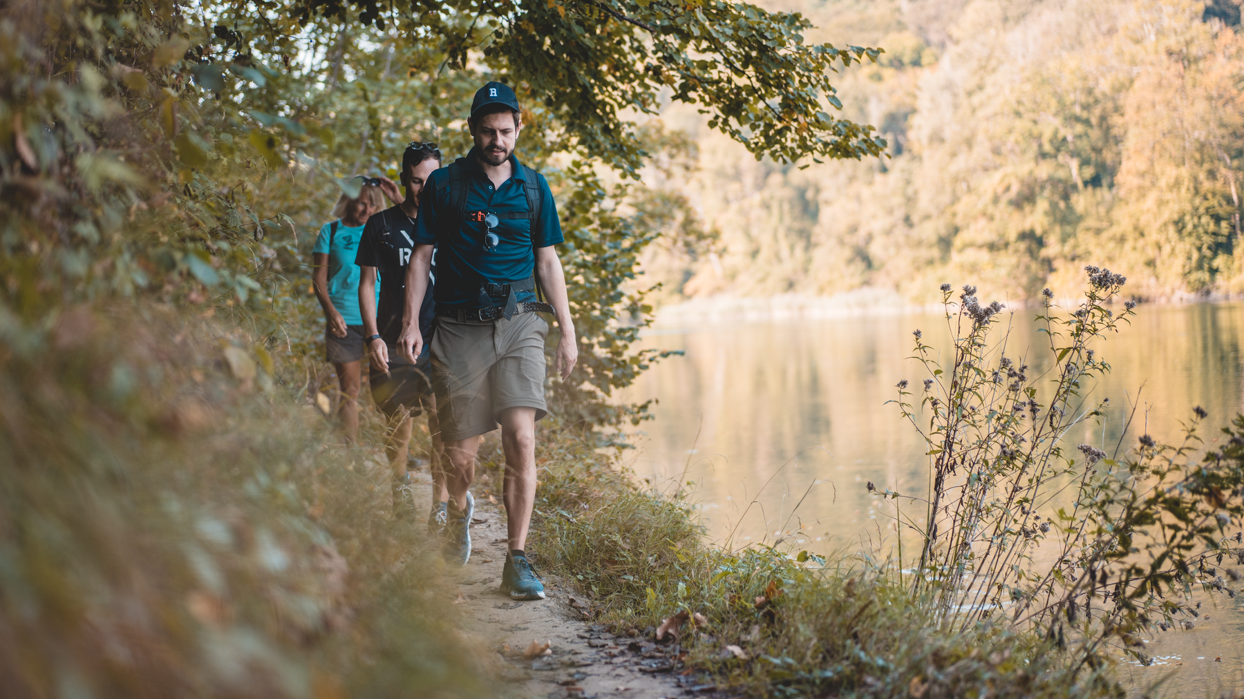 Bereits mit viel (Hunde-)Verstärkung startete die Wandergruppe die zweitletzte Etappe von Tössegg nach Rheinau. Auch Wetterfrosch Peter Wick stiess zu den Wandervögeln dazu. Eine wunderschöne Route entlang des Rheins und des Biberwegs wartete auf die Wandernden, wobei die Schönheit der Landschaft vermutlich der Anlass war, dass Dominik Widmer verloren ging. Nach wiederholtem Warten auf Herrn Widmer, fand die Gruppe schliesslich wieder zusammen. Zum Glück! Denn zur Mittagspause wartete eine grosse Überraschungsparty. Denn heute nämlich hat Dominik Widmer Geburtstag. Seinen 35. konnte er unterwegs mit einem schönen Geburtstagskuchen der Stiftung St. Jakob Zürich und vieler seiner extra angereisten Freunde feiern. Nach diesem schönen Erlebnis und einem Glässchen Schämpis machte sich die Gruppe weiter über Stock und Stein dem Rhein entlang Richtung Zielort: Rheinau.