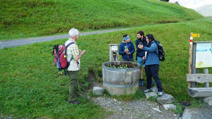 Nina und Dominik starten ihre Wanderung in Elm bei der Elmer Citro Mineralquelle. Vreni Schneider, ehemalige Skirennfahrerin, nimmt die beiden hier in Empfang und zeigt ihnen ihr wunderschönes Elm. Verstärkung bekamen Nina und Dominik aber auch von anfang an von Hörer Peter aus Winterthur und Hörer Mischa aus Ennenda. Letzterer hat auch einige spannende Fakten parat. Genau so wie Fritz Marti, der Präsident der Glarner Wanderwege, der unterwegs dazu stiess und sein Wissen über das Glarnerland grösszügig teilte. Fun fact: Der höchste Strommast von ganz Europa steht im Glarnerland! Nach vielen wunderbaren Begegnungen und einem aufregenden ersten Wandertag, machten sich Nina und Dominik per Gondel zu ihrem Schlafquartier - der Aeugstenhütte - hoch über Enneda und mit grandioser Aussicht.
