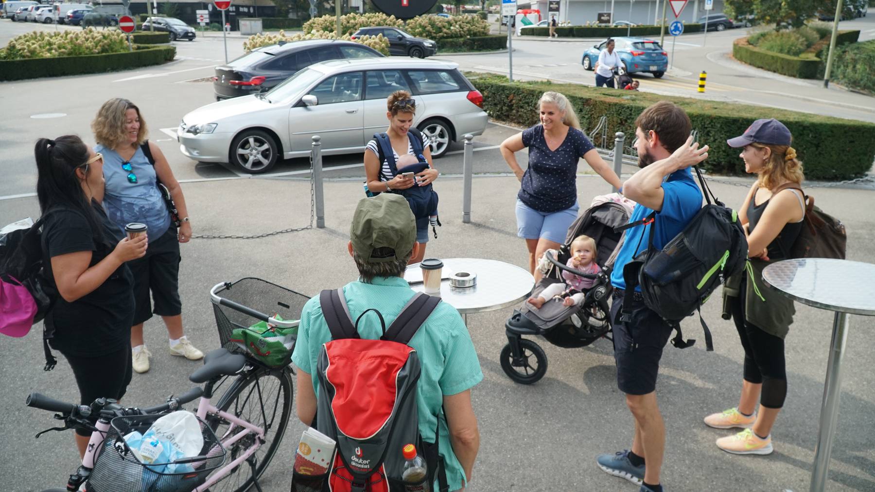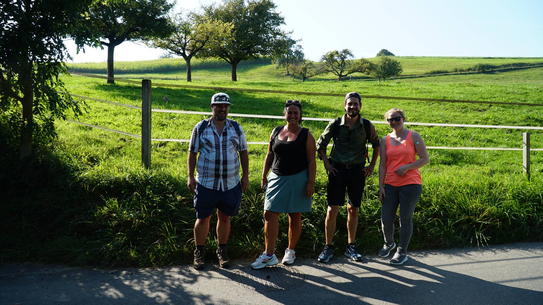 In voller Wandermontur startete die sechste Etappe in Oerlikon - und das bereits mit drei Mitwanderinnen. DIe Gruppe machte sich auf, vorbei an weiten Feldern, durch schöne Wälder bis nach Kloten zu einer Kaffeepause und dann weiter bis zu einem märchenhaften Weiher und dann nach Egetswil. Dort haben Markus und Astrid die Wandergruppe zu einem Boxenstop eingeladen. Die «Ufsteller Unterwägs»-Wandergruppe vergrösserete sich immer mehr. Kurze Verschnaufpause oberhalb von Bülach und dann ein gemütliches Zmittag. Nina hat ihre Blasen verarztet und weiter ging's bis noch eine Überraschung auf die Gruppe wartete. Nadja und ihre zwei Arbeitsgspänli warteten mit Wasser und Glacé. Nach der kleinen Stärkung ging's dann schliesslich weiter zum Zielpunkt: Tössegg. Wunderschön gelegen am Rhein konnten Nina und Dominik dann ihre Zelte aufschlagen und mit einem kühlen Bier auf den erfolgreichen Tag anstossen.